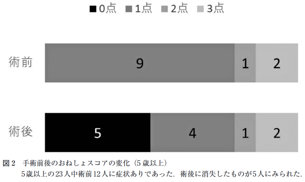 表は睡眠時無呼吸に対してアデノイド切除・扁桃摘出術を行った子どものおねしょの回数の減少を示しています。5歳以上であれば、良い結果が期待できそうですね。